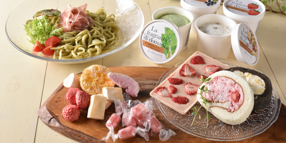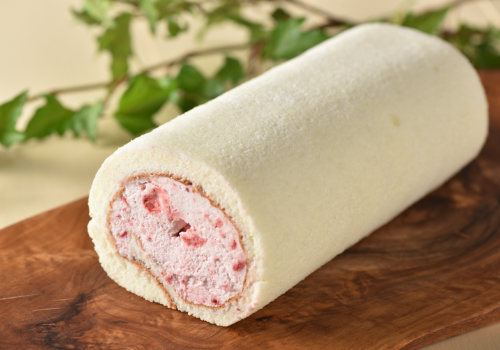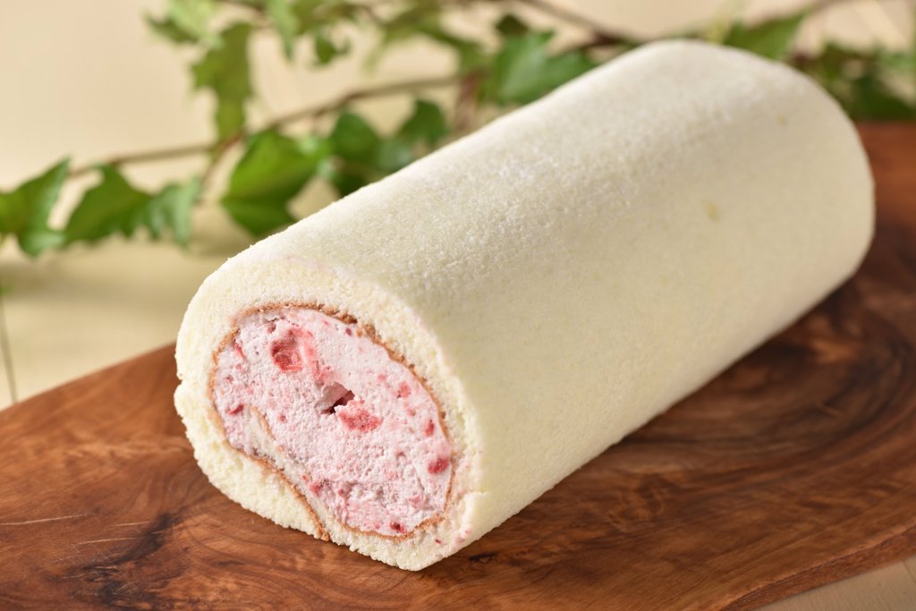 【米粉ロールケーキ(アスカルビーいちご)】生地のスポンジケーキは米粉100%。みずみずしいあすかルビーいちごをフリーズドライにし、粗く砕いて練り込んだ、見た目も鮮やかな逸品です。