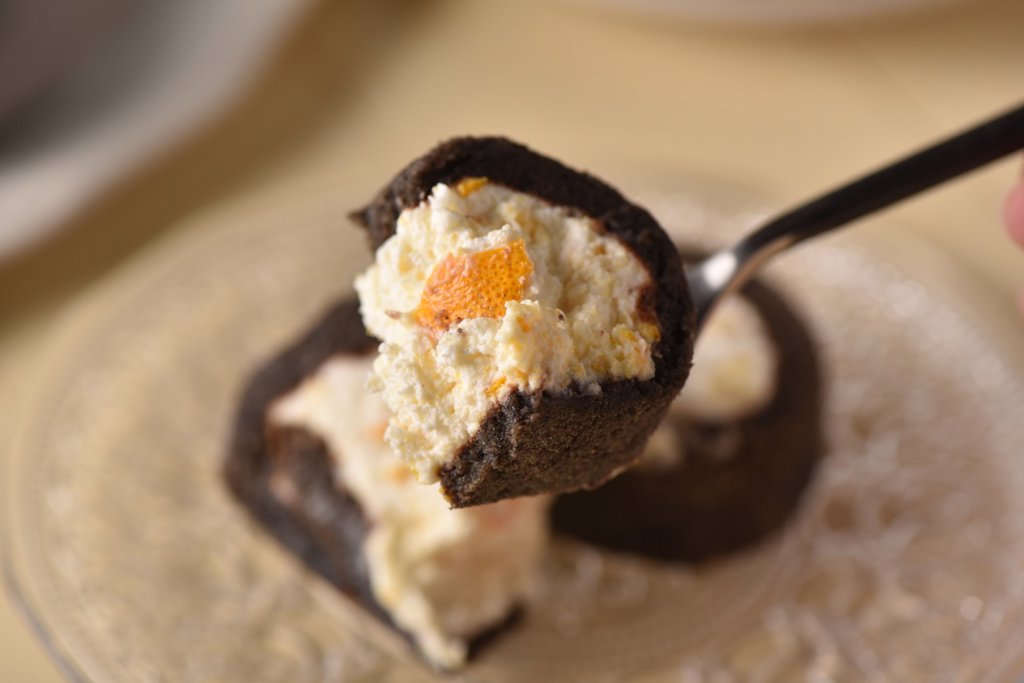 見た目の黒いスポンジケーキは黒米米粉を100%使用し、着色剤は一切使用していません。宮川早生という皮の苦みが少ない品種を使用しています。餅種の黒米の食感と柑橘の味わいが口の中で広がります。